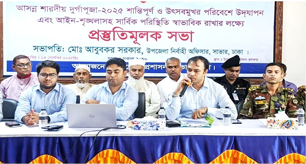 আসন্ন শারদীয় দুর্গাপূজা শান্তিপূর্ণ, নিরাপদ ও সুষ্ঠুভাবে সম্পন্ন করার লক্ষ্যে সাভারে এক প্রস্তুতিমূলক সভা অনুষ্ঠিত হয়েছে। মঙ্গলবার সকালে উপজেলা প্রশাসনের উদ্যোগে আয়োজিত এ সভায় সভাপতিত্ব করেন সাভার উপজেলা নির্বাহী কর্মকর্তা (ইউএনও) আবুবকর সরকার।