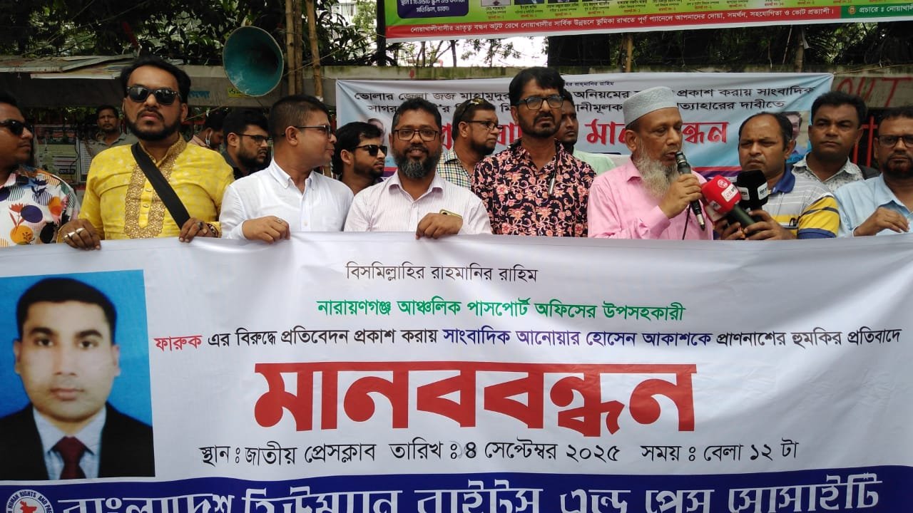 সংবাদ প্রকাশ করায় সম্পাদককে হত্যার হুমকির প্রতিবাদে মানববন্ধন অনুষ্ঠিত